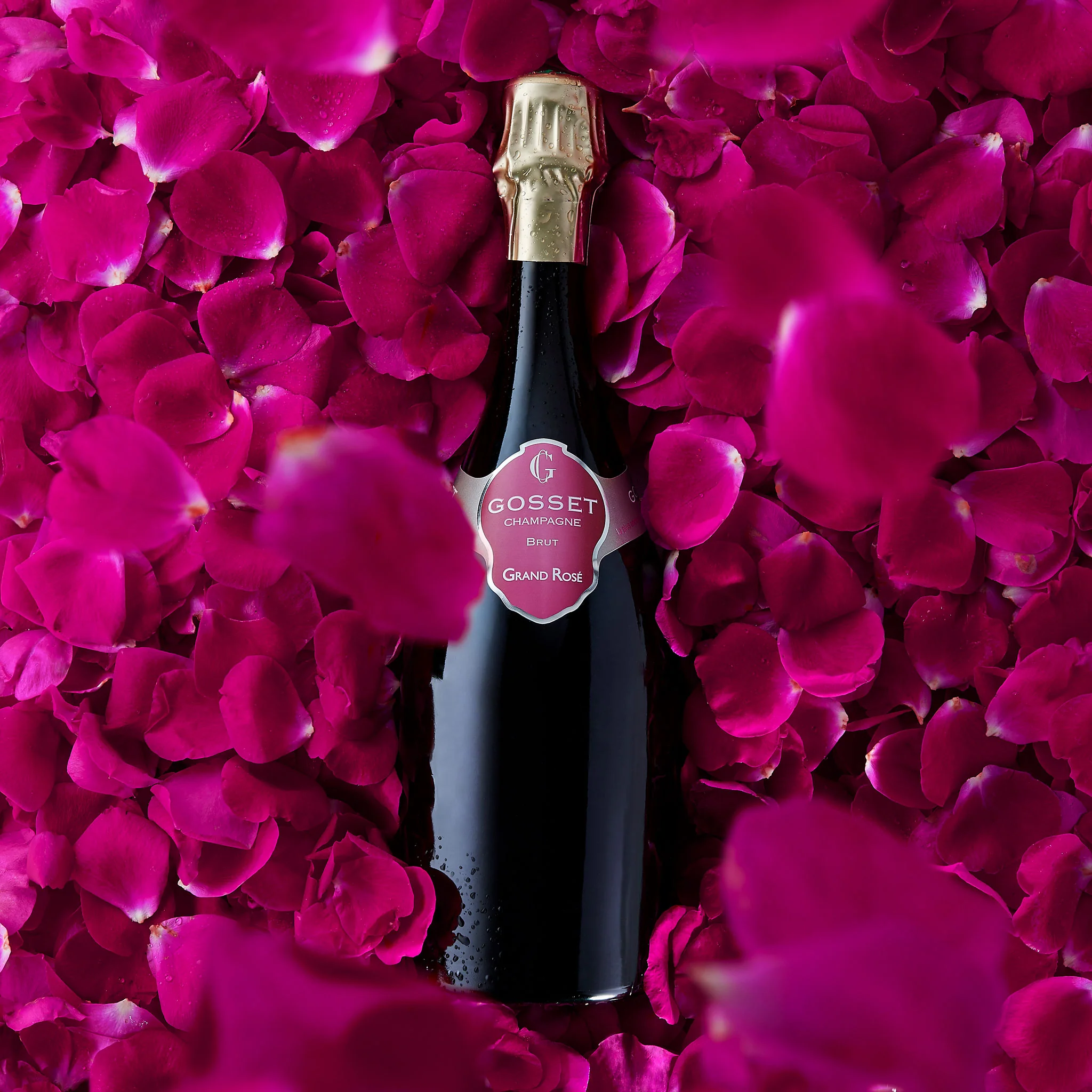 De Gosset Grand Rosé in de kenmerkende bolle fles in stijlvolle, feestelijke geschenkverpakking, een mooi cadeau!